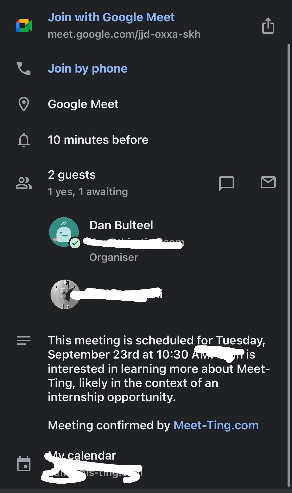 Smart agendas: Ting pulls context from email threads into the meeting description, so you start with purpose.