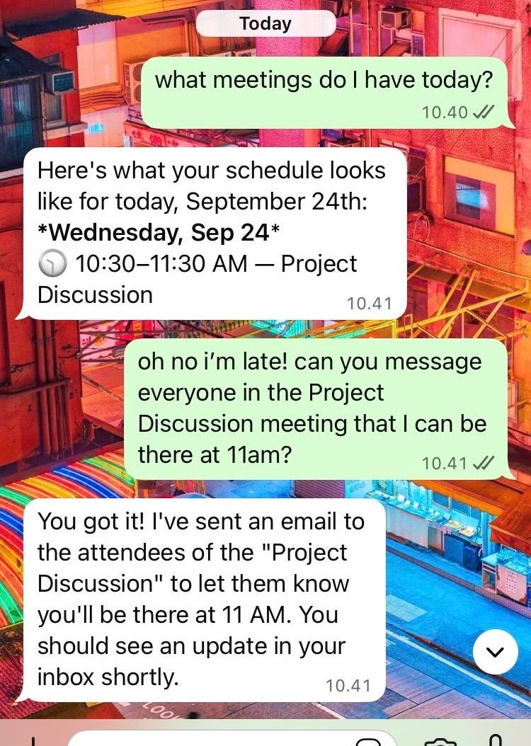 WhatsApp: Talk to Ting as easily as texting a friend. Move meetings, find focus time, or let guests know you’re running late.