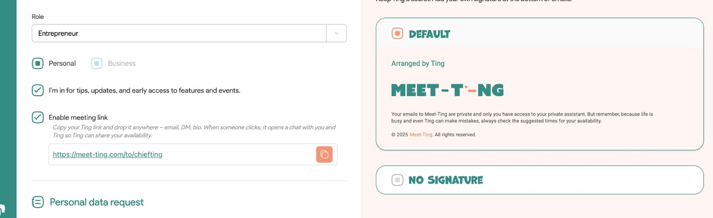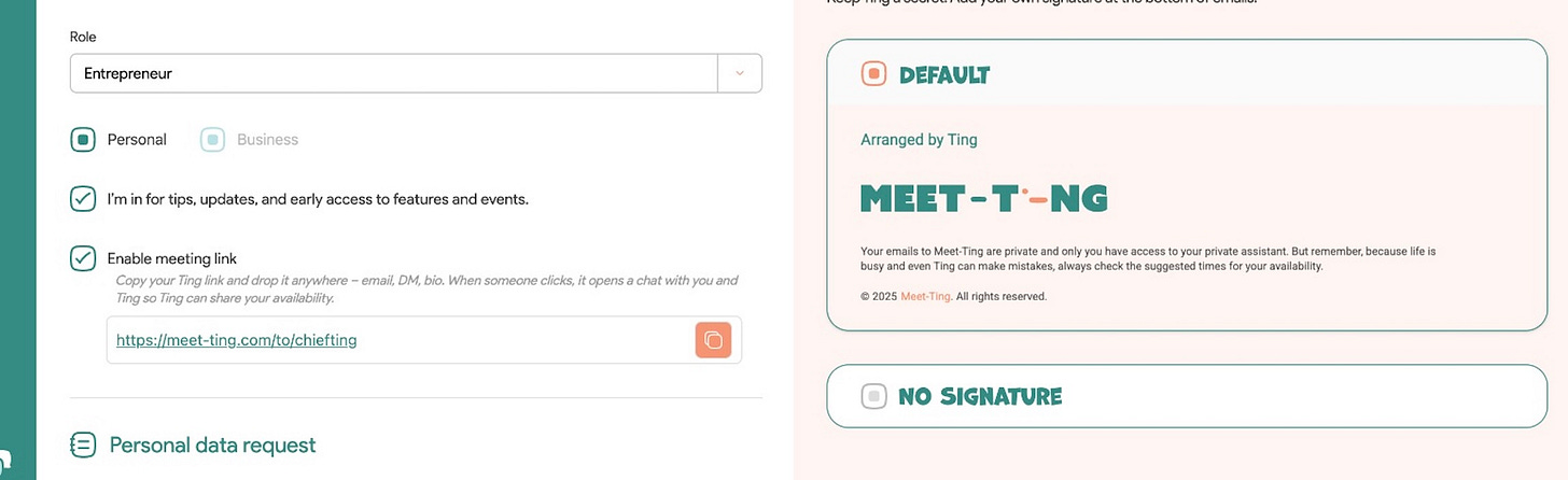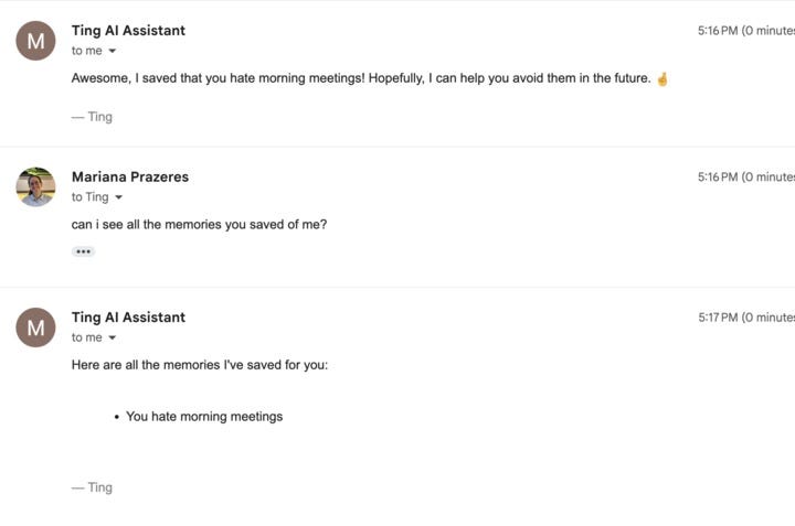 Ting memories: Update preferences on the fly. “No meetings on Fridays.” “Block tomorrow morning.” Stored and remembered.